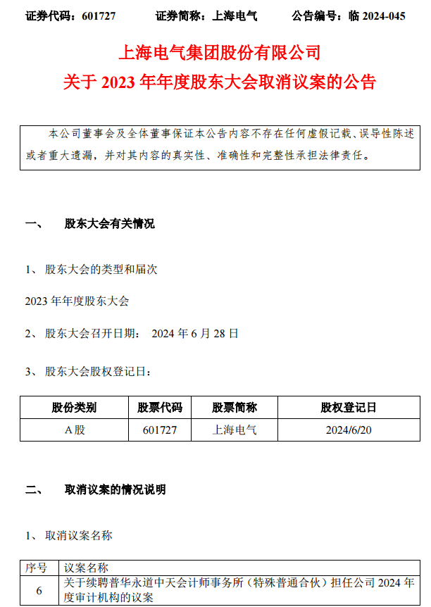 上海電氣公告稱,鑒于近期相關(guān)市場(chǎng)事項(xiàng)還需進(jìn)一步核實(shí),經(jīng)公司董事會(huì)五屆九十六次會(huì)議審議通過,決定取消原定提交2023年年度股東大會(huì)審議的《關(guān)于續(xù)聘普華永道擔(dān)任公司2024年度審計(jì)機(jī)構(gòu)的議案》。