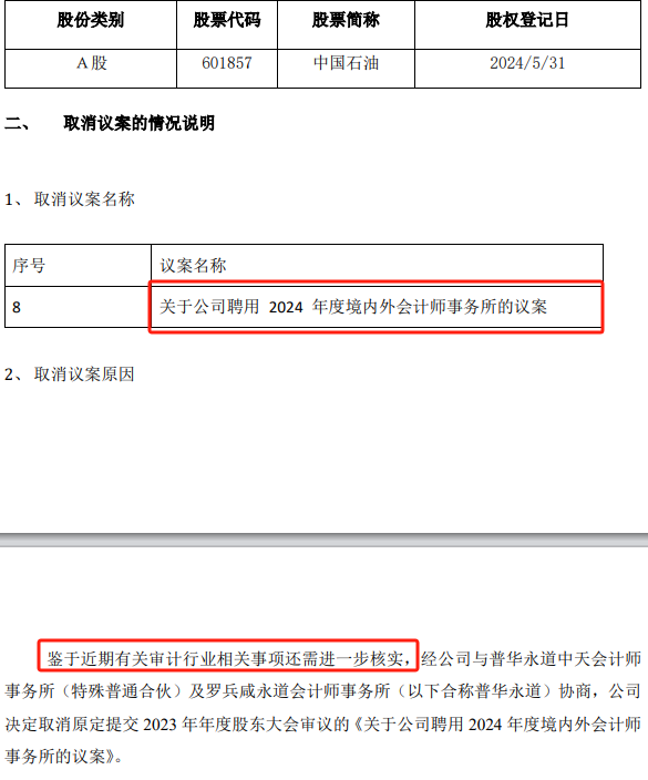 比如,中國(guó)石油5月30日晚間公告稱,鑒于近期有關(guān)審計(jì)行業(yè)相關(guān)事項(xiàng)還需進(jìn)一步核實(shí),公司決定取消原定提交2023年年度股東大會(huì)審議的《關(guān)于公司聘用2024年度境內(nèi)外會(huì)計(jì)師事務(wù)所的議案》。