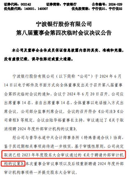 6月21日晚間,寧波銀行公告稱,經(jīng)公司與普華永道協(xié)商,鑒于其近期相關(guān)事項(xiàng)尚待進(jìn)一步核實(shí),基于審慎性原則,公司決定取消已經(jīng)2023年年度股東大會(huì)審議通過的《關(guān)于聘請(qǐng)外部審計(jì)機(jī)構(gòu)的議案》。