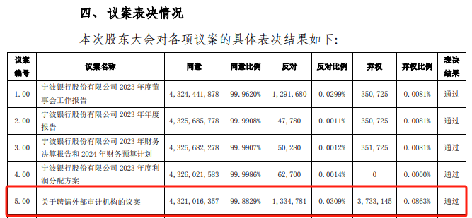 5月15日,寧波銀行召開2023年年度股東大會(huì),審議通過的議案包含《關(guān)于聘請(qǐng)外部審計(jì)機(jī)構(gòu)的議案》。