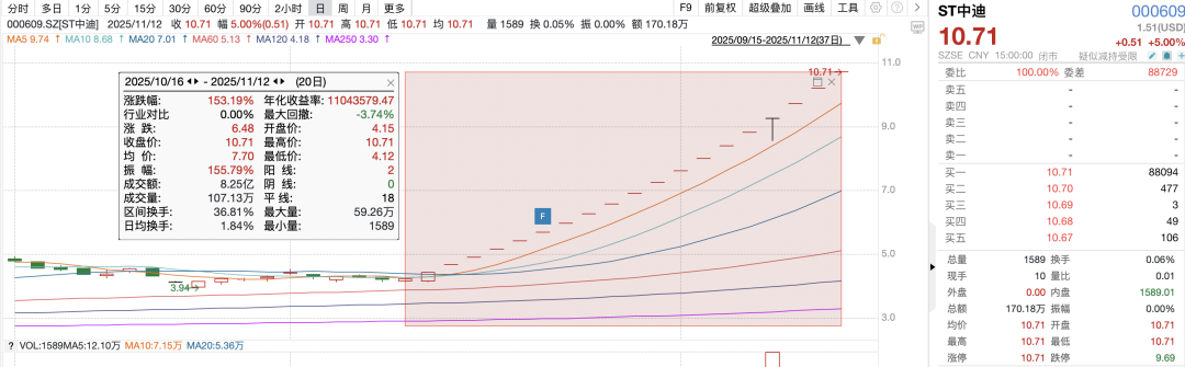 數(shù)據(jù)顯示,ST中迪股價(jià)自10月16日至11月12日期間,累計(jì)漲幅高達(dá)153.19%,其間更是出現(xiàn)七次股價(jià)異常波動(dòng)。這種劇烈的股價(jià)波動(dòng)與公司基本面形成鮮明對(duì)比。截至11月11日,ST中迪靜態(tài)市盈率為-12.83倍,滾動(dòng)市盈率為-15.88倍,市凈率為-376.33倍,而同期中國(guó)上市公司協(xié)會(huì)行業(yè)分類房地產(chǎn)業(yè)的靜態(tài)市盈率為28.62倍,滾動(dòng)市盈率為26.19倍,市凈率為0.93倍。公司各項(xiàng)估值指標(biāo)與行業(yè)平均水平存在嚴(yán)重偏離,顯示出股價(jià)波動(dòng)嚴(yán)重背離公司基本面。